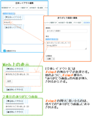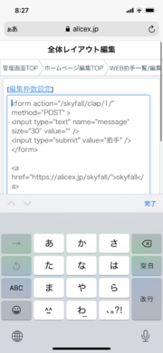 ALICE+サポート ユーザー助け合い掲示板 TOPページ ユーザー助け合い掲示板 拍手のお礼について 編集 キャンセル 削除 アク禁 アク禁解除 キャンセル 凍結 0 ももこ iPhone はじめまして。 拍手のお礼として、拍手をした方に画面追加の作品ページに飛ばしたいのですが、どうもうまくできません。 うまく説明できないのですが、よろしくお願いします。 3 10/16 11:15 返信 コメント投稿 検索 11 しち SOG03 >>8 あッッッッすみません1つ致命的な書き間違いが……。 のちのち検索してここを参考にしようとする人もいらっしゃるかもしれないので念のため訂正しておきます💦💦 (ご返信は不要です〜!) >>8 3️⃣▼【トップデザイン編集】の、拍手を設置したい場所に以下を書き込む >> ━━━━━━━━━━ >> ##clap1(拍手)## >> ━━━━━━━━━━ この独自タグ、間違えて括弧が全角になっていました……。正しくは以下です。 ━━━━━━━━━━ ##clap1(拍手)## ━━━━━━━━━━ 括弧は半角!! ……です。まことにすみませんでした……m(_ _)m💦 10/31 11:05 返信 10 しち SOG03 >>9 解決してよかったです! サイト頑張ってください〜! 10/30 18:46 返信 9 ももこ iPhone >>8 凄い!ご丁寧に教えていただいたやり方でできました!!! できて思わず声に出して感動しちゃいました。笑 説明下手、不足の私に最後まで親身になってご回答いただき、本当にありがとうございました。 本当に助かりました^_^ ありがとうございました(*^^*) 1 10/30 18:18 返信 8 しち SOG03 >>7のような拍手なら、【全体レイアウト】に『<form action=…</form>』を書く必要はないです。 【全体レイアウト】にはそのまま『#clap#』の独自タグだけ入れておいてください。 念のため整理しますが、お礼小説ページに行くまでのステップはこんな感じですかね? 〰️〰️〰️〰️〰️〰️〰️〰️〰️〰️〰️〰️ @《トップページ》の拍手ボタン押下 ↓ A《拍手コメントフォームのページ》で拍手ボタン押下 ↓ B《お礼小説ページ》で小説が読める 〰️〰️〰️〰️〰️〰️〰️〰️〰️〰️〰️〰️ 上記@〜Bの経路を作るのなら、『ありがとう画面』は最低2つ(AとB)必要ですね。 現在『ありがとう画面』は、《お礼小説ページ》だけですか? もしそうなら【ありがとう画面追加】で『ありがとう画面』を1つ新たに作ってください。 それをA《拍手コメントフォームのページ》にします。 >1️⃣《拍手コメントフォームのページ》には以下のように書く ━━━━━━━━━━ 拍手ありがとうございます! #msg_拍手# ━━━━━━━━━━ *「#msg_拍手#」というのは、拍手フォーム(一行コメント欄+拍手ボタン)を表示する独自タグです。 *>>7などで書かれていた「<form action=...>〜</form>」と見た目は同じです。 *>>7の「<form action=...>〜</form>」をそのままここに書き込むと『次の《お礼小説ページ》へ飛べない』ということが起きるので、独自タグに変更しました。 >2️⃣【画面並べ替え】で『ありがとう画面』の表示順を変更する 拍手管理トップへ戻って、【画面並べ替え】を押下。 すると ━━━━━━━━━━ [ 10 ]↑↓ ありがとう画面タイトル1 [ 20 ]↑↓ ありがとう画面タイトル2 ━━━━━━━━━━ というような画面になります。 *※今は[ 数値 ]のところは無視してください。 矢印ボタンで『ありがとう画面』の表示順を変更できるので、 《拍手コメントフォームのページ》にしたい画面を、一番上に配置してください。 *上にあるものから表示されるので、上例だったら拍手ボタンを押すごとに、 *「ありがとう画面タイトル1」→「ありがとう画面タイトル2」 *と表示されます。 *なので、《拍手コメントフォームのページ》→《お礼小説ページ》の順になるよう並び替えてください。 >3️⃣▼【トップデザイン編集】の、拍手を設置したい場所に以下を書き込む ━━━━━━━━━━ ##clap1(拍手)## ━━━━━━━━━━ *ボタンではなくて『拍手テキストリンク』という形での設置になります。 *どうしてもボタンの形式で設置したいときはまた別のやり方がありますが、 *今回はとにかく@→A→Bの経路で《お礼小説ページ》に飛べるかを確認してみてください。 ・ ・ ・ とりあえず、1回このように書いてみてもらってよいですか? 細かいデザインとかはさておき、経路確認をしてみてください。 あと、 >>7 そうなると貼り付け時のレイアウトに何かタグを入れないといけなくなりますか?? 今回説明したやり方なら、 ***【貼り付け時レイアウト】には何も書かなくていい*** ……です。 でもまあわざわざ消す必要もないので、前回書き込んだ内容をそのまま残しておいてもOKです。 これは例えば、 『トップページに拍手コメントフォームを設置したい』ときなどに使います。 1,【貼り付け時レイアウト】に拍手コメントフォームを書く 2,【トップデザイン編集】の、拍手コメントフォームを設置したい場所には「##clap1##」の独自タグを書く →すると「##clap1##」の場所に拍手コメントフォームが表示され