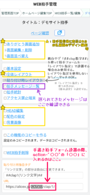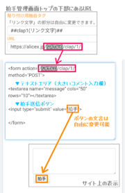 ALICE+サポート ユーザー助け合い掲示板 TOPページ ユーザー助け合い掲示板 コメントフォーム 編集 キャンセル 削除 アク禁 アク禁解除 キャンセル 凍結 0 Anonymous K 画像のようなメッセージを送るフォームを作りたいのですがそれはどこの項目で作れますか? わかる方よければ教えてください。 1 03/14 02:05 返信 コメント投稿 検索 2 Anonymous K >>1 しち様!数少ない提示だったにも関わらずご丁寧にありがとうございました! テンプレの提示をしていいものなのか、お借りしているものなのでどこまでが無断転載に入るのかわからず画像のみとなってしまいました。 これからは提示をした上でご助言をいただきたく思います!今回もご丁寧な説明のためなんとか出来そうです。本当にありがとうございました! かなり返信が遅れてしまい申し訳ありません。 04/16 22:28 返信 1 しち SOG10 >>0 コメントフォーム的なものを作るには? 『WEB拍手』を使うのがよいかと。 設置方法はいくつかありますが、一番ポピュラーな、いわゆる手書き拍手フォームをば。 >1️⃣ まだ作っていないなら、「WEB拍手作成」から拍手機能を作成 どこにあるか分からない場合は、画像@をご参照ください。 >2️⃣ 拍手コメントフォームを設置したい場所(トップページや子ページ等)に、以下のHTMLを書く ━━━━━ <form action="/サイトID/clap/拍手番号/" method="POST"> <textarea name="message" cols="50" rows="5"></textarea> <input type="submit" value="拍手"> </form> ━━━━━ *🟩 変更必須箇所 ・『サイトID』 ・『拍手番号』 拍手番号は、初めて作った拍手機能なら『1』です。 サイトID・拍手番号を確かめたい場合は、拍手管理画面トップの下部にある『URL』を参考にしてください。(画像A・B) *🟩 任意で変更可能な箇所 ・テキストエリアの『cols="50" rows="5"』 ・送信ボタンの『拍手』文言 colsはテキストエリア(コメント入力欄)の横幅、rowsは行数(縦幅)なので、お好きに変更・削除OKです。 ※ただしCSSで高さや幅を指定していた場合は、cols・rowsの値を変更しても見た目が変わらないかもしれません。 送信ボタンの文言は、『value="拍手"』の「拍手」部分を変更すれば変えられます。(「送信」「send」「clap」など) >🟦 デザインを変更したいときは この拍手フォームのデザインは、『設置したページのCSS』が適用されます。 つまり、トップページに設置したならトップページのCSSが適用される……ということです。 拍手機能管理画面内にある【HEAD編集】にもCSS(<style>〜</style>)を記入できますが、これは『拍手を送信した後に表示される「ありがとう画面」のデザイン』を指定するところです。 トップページや子ページ等に設置した拍手フォームのデザインは、前述のとおり『設置したページのCSS』が適用されます。 >🟦 テンプレなどを使いたいときは テンプレのHTMLやCSSを提示したほうが、得たい回答が得られやすいかと思います。 (というかデザイン系の問題はHTML・CSSが分からないと回答のしようが無いです……) また、その使いたいテンプレがALICE+用のものでないときは、それも提示するのがおすすめです。 例えばナノ用テンプレやHTMLをALICE+で使うとなったら、『絶対にここを書き換える必要がある』といった注意ポイントがあったりするので。 1 03/20 22:11 返信 1ページ中1ページ目 128 view 残り書き込み 9998 件 人気スレ 名前変換について 2020年05月15日 01時48分 2 ログインできなくて困っています 2021年09月15日 20時40分 2 小説について 2026年01月13日 19時51分 0 テンプレのCSSの編集方法 2020年04月03日 02時27分 3 関連スレ 拍手のコメントフォームについて 2020年07月26日 20時36分 2 不具合報告掲示板 掲示板TOPへ サイトTOPへ ALICE+サポート