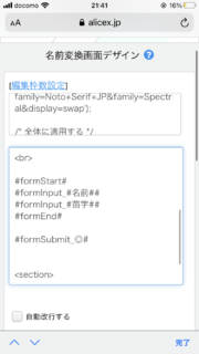 ALICE+サポート ユーザー助け合い掲示板 TOPページ ユーザー助け合い掲示板 名前変換ができない件について 編集 キャンセル 削除 アク禁 アク禁解除 キャンセル 凍結 0 nao iPhone 初めまして。質問失礼致します。 今回初めてのサイト作成で、テンプレートなどお借りし少しづつ体裁を整えているのですが、小説の名前変換がうまく機能せず困っています。 子ページに直接名前変換画面へのurlを貼る事ができたのですが、そもそもその変換画面が上手くいっていないようで…? 変換したい名前を入力し設定ボタン(◎)を押してもうんともすんとも言いません。 どこに問題があるのかすら分からず、一先ず名前変換画面デザインの写真を一緒にあげておきます。 助けていただけますと幸いです。 10/17 21:49 返信 コメント投稿 検索 1 nao iPhone すみません、解決しました。 10/18 01:36 返信 1ページ中1ページ目 2978 view 残り書き込み 9999 件 人気スレ 中央寄せができません 2023年09月15日 14時44分 14 拍手のお礼について 2021年10月31日 11時05分 11 ブログ村について教えて下さい 2022年10月01日 09時18分 6 ルビなどのタグ内にfont-familyが効かない 2023年09月19日 13時13分 6 関連スレ 送信メールの文字数制限について 2026年03月30日 13時40分 0 ユーザー助け合い掲示板 小説途中の広告について 2026年03月28日 00時52分 4 要望掲示板 拍手について 2026年02月14日 14時12分 0 タグ・デザイン掲示板 CSSのwidthについて 2026年02月04日 14時31分 0 タグ・デザイン掲示板 小説について 2026年01月13日 19時51分 0 ユーザー助け合い掲示板 掲示板TOPへ サイトTOPへ ALICE+サポート