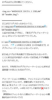 ALICE+サポート タグ・デザイン掲示板 TOPページ タグ・デザイン掲示板 タグの画像表示 編集 キャンセル 削除 アク禁 アク禁解除 キャンセル 凍結 0 Anonymous Chrome テンプレートを借りているのですが、ヘッダー画像がうまく表示されません。 タグはテンプレートサイトの方から、URLはそのまま画像URLをコピペしてるのですが、どこか間違っているでしょうか? <img src=”##IMAGE_DATA_1_URL##” id="header_img"> 1 09/14 17:11 返信 コメント投稿 検索 3 Anonymous Chrome >>2 しち様 ご丁寧な対応と説明をしていただきありがとうございます! しち様の通りに書き換えてページ確認をしたところ、テンプレートサイトと同じように表示されました。 ひとりであわあわしていたので助かりました。 09/16 15:23 返信 2 しち SOG03 >>1 です。 閲覧環境のフォントによっては、そもそも>>1の文章も和文・英文の見分けがつかず、かなり意味不明な文章に見えるかもなので……明朝体にした文章も置いておきます。 1 09/14 20:22 返信 1 しち SOG03 >>0 まずは以下に書き換えてください。 ━━━━━━━━━━ <img src="##IMAGE_DATA_1_URL##" id="header_img"> ━━━━━━━━━━ どこがどうダメだったかというと、 > <img src=”##IMAGE_DATA_1_URL##” id="header_img"> 上記のHTMLタグ内に、『和文ダブルクォーテーション』が入っているのがアウトでした。 > src=”##IMAGE_DATA_1_URL##” ここの、『 ” 』が両方とも和文(=日本語文字)のダブルクォーテーションになっています。 HTMLタグは半角英数字で書かねばならないので、ここに和文記号が混ざったせいでHTMLタグが機能しなくなりました。 なので、半角英字のダブルクォーテーションに直せば意図通りの表示になるはずです。 クォーテーションの種類は、フォントによっては死ぬほど見分けづらいので、図解を置いておきます。 和文 or 英文クォーテーションかが分かりやすいフォントにしています。>>0をコピペした結果が❌のほうです。 (明朝体のフォントなら大抵はクォーテーションの種類が分かりやすいです) 1 09/14 20:00 返信 1ページ中1ページ目 901 view 残り書き込み 9997 件 人気スレ アンケートの投票ボタン 2020年12月27日 23時20分 4 アンケートについて 2020年02月25日 07時00分 4 テンプレート通りの形にならない 2021年11月02日 00時11分 13 字下げをすると改行も一緒にしてしまう 2023年01月27日 22時36分 8 関連スレ 掲示板TOPへ サイトTOPへ ALICE+サポート